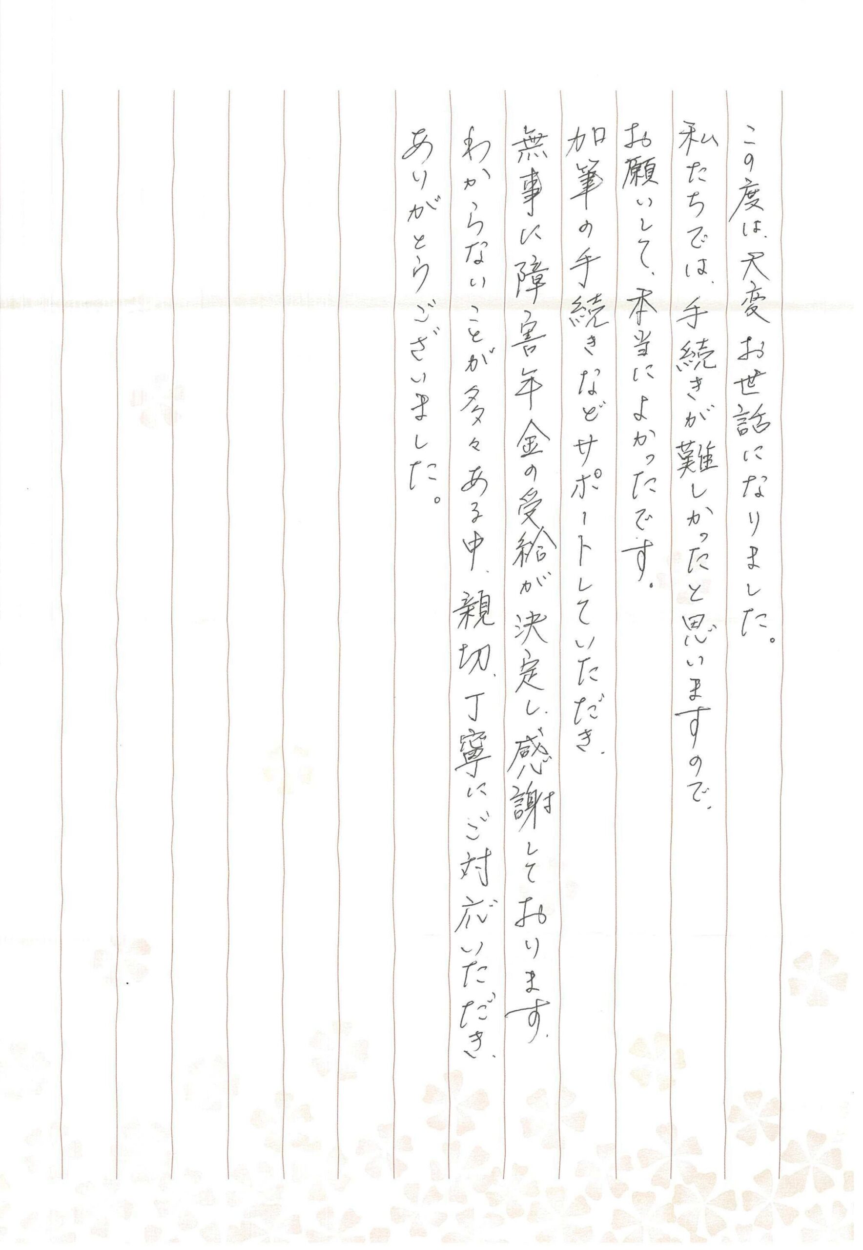 無事に障害年金の受給が決定し、感謝しております。