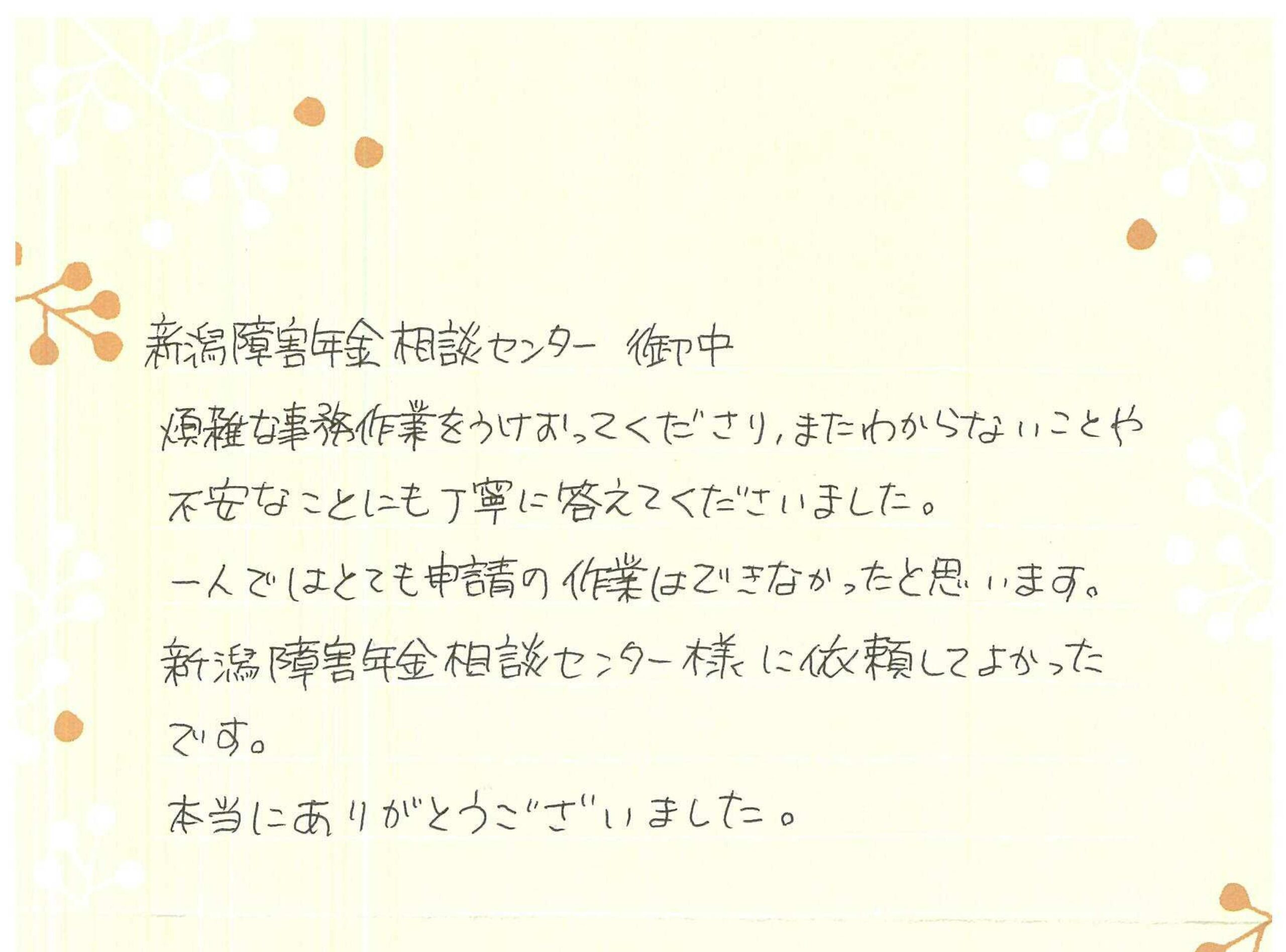 新潟障害年金相談センター > 感謝のお手紙 > お客様の声366