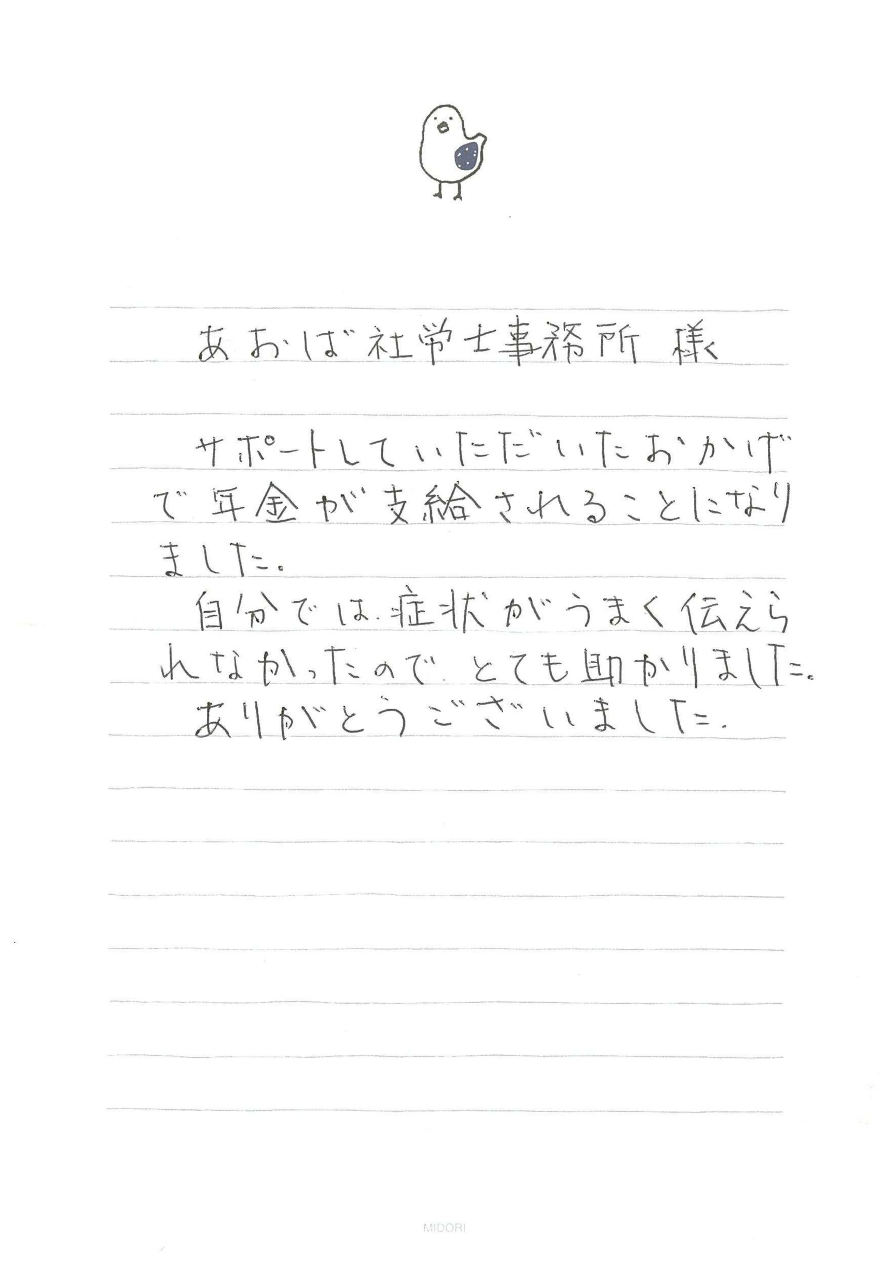 新潟障害年金相談センター > 感謝のお手紙 > お客様の声370